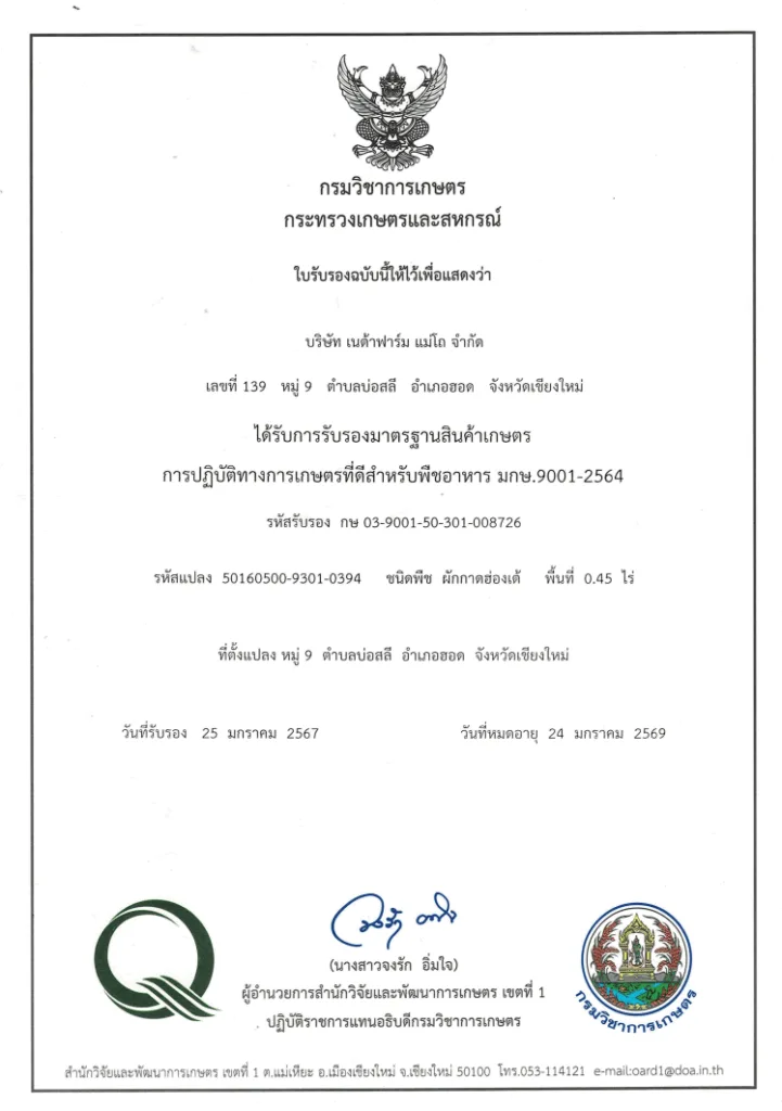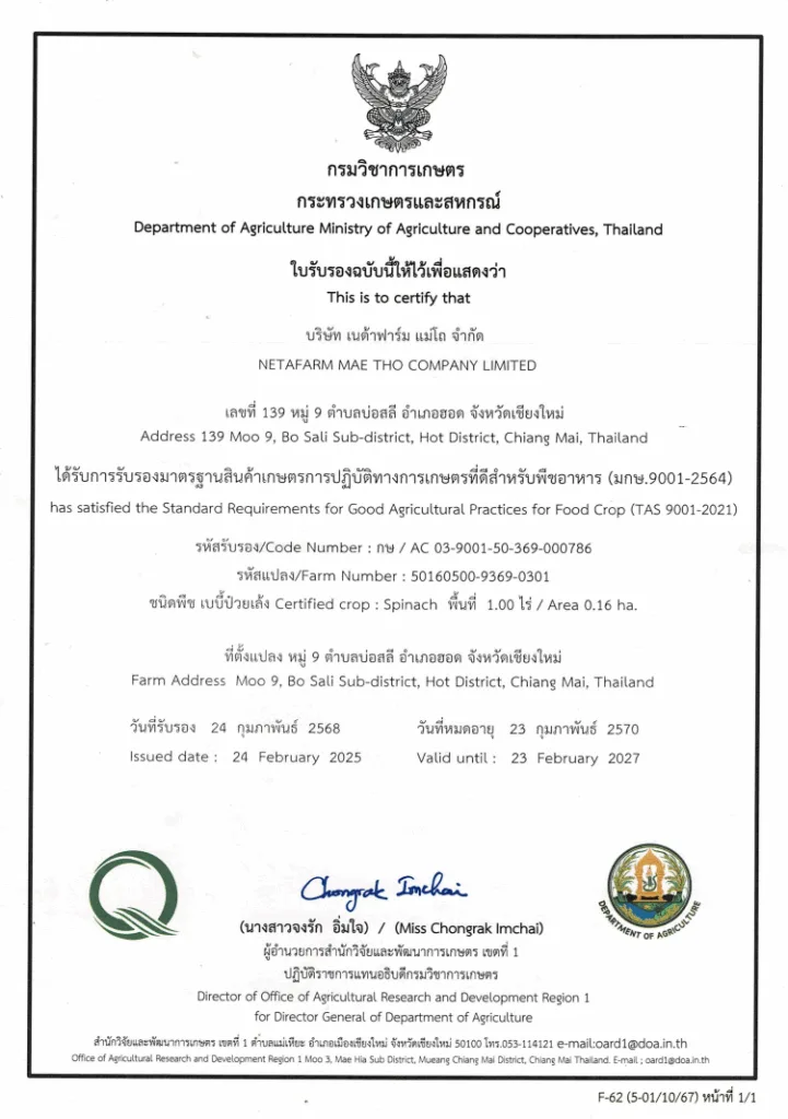 “ฟาร์มของเราได้รับการรับรองมาตรฐาน GAP จากกรมวิชาการเกษตร ซึ่งเป็นมาตรฐานการเกษตรปลอดภัยระดับประเทศ เพื่อให้มั่นใจว่า ผักทุกต้น ปลอดภัย สดใหม่ และใส่ใจสิ่งแวดล้อม”